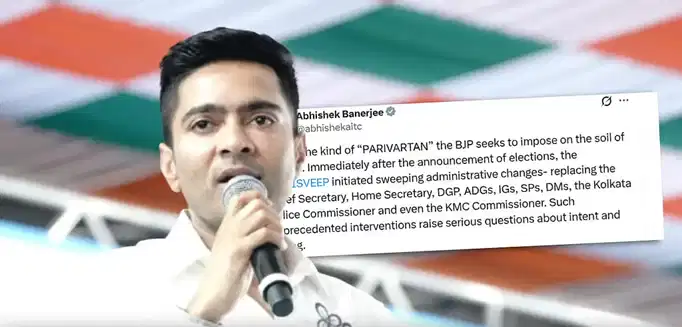 अपने X हैंडल पर पोस्ट कर अभिषेक बनर्जी ने लिखा है कि चुनाव की घोषणा के तुरंत बाद आयोग ने बड़े स्तर पर प्रशासनिक बदलाव किया। इसकी वजह से मुख्यसचिव, गृह सचिव, डीजीपी, एडीजी, आईजी, एसपी, डीएम, कोलकाता पुलिस कमिश्नर से लेकर केएमसी (कोलकाता नगर पालिका) के कमिश्नर को भी हटा दिया गया।