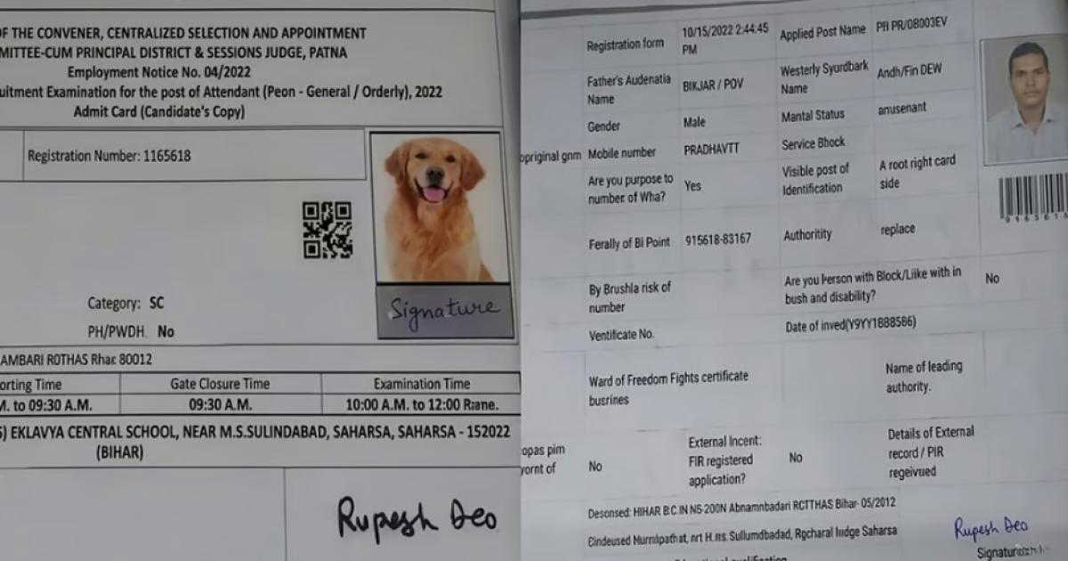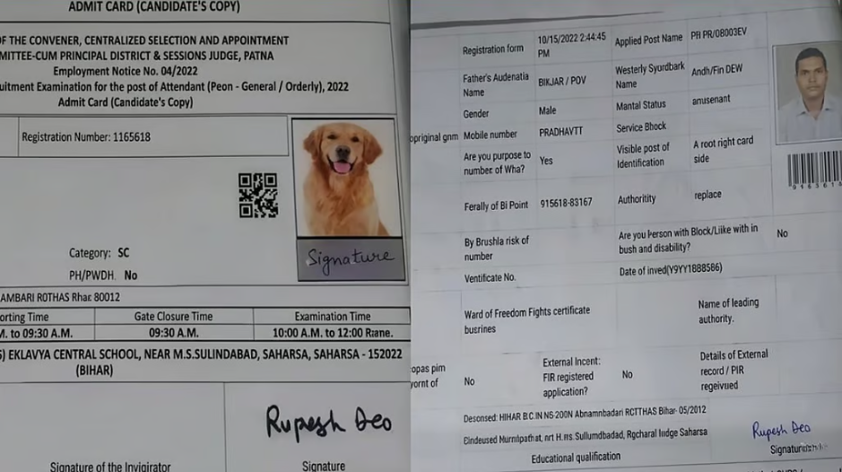 पटना: सरकारी नौकरी की परीक्षा का एडमिट कार्ड हाथ में पाकर बिहार के एक युवक की आंखें फटी की फटी रह गईं। रितेश कुमार ने 2022 में चपरासी पद की भर्ती परीक्षा के लिए आवेदन किया था। चार साल के लंबे इंतजार के बाद जब परीक्षा का एडमिट कार्ड हाथ में आया, तो उसमें रितेश की जगह एक कुत्ते की तस्वीर लगी हुई थी। 15 मार्च को यह परीक्षा होने वाली है। अपनी तस्वीर की जगह गोल्डन रिट्रीवर की तस्वीर देखकर परीक्षार्थी हैरान रह गए। इस घटना के बाद बिहार सरकार की भर्ती प्रक्रिया पर सवाल उठने लगे हैं।