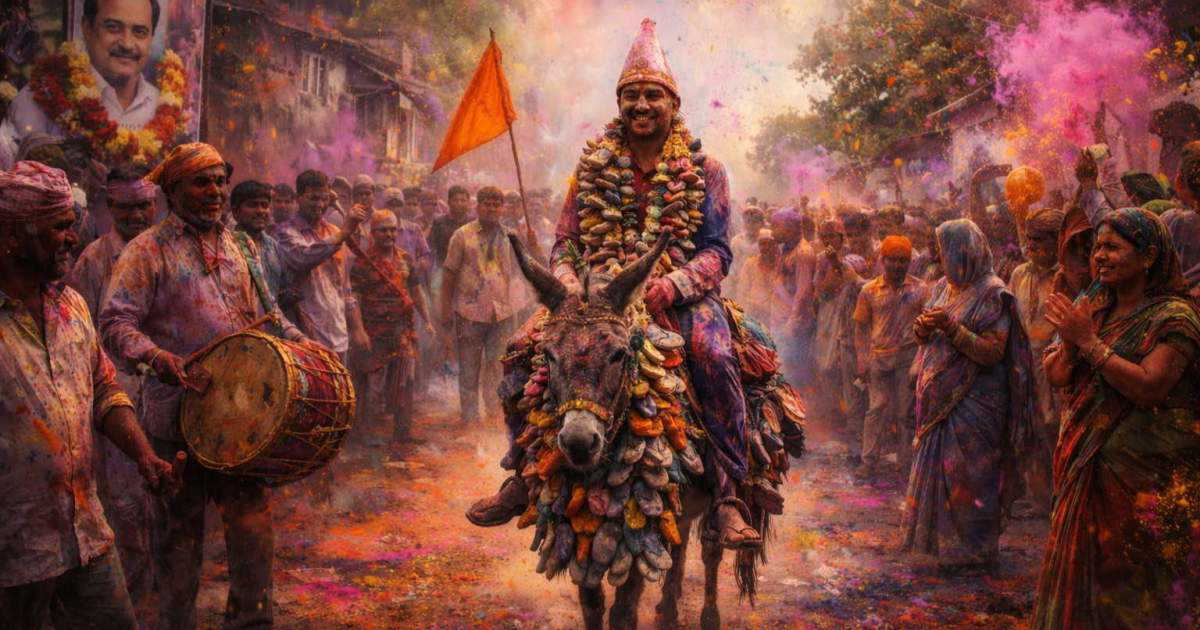 होली या धुलिवंदन की सुबह ढोल की थाप और रंगों की बौछार के बीच दामाद को गधे पर बैठाया जाता है। पुराने जूतों की माला पहनाकर उसे गांव की गलियों में घुमाया जाता है, जबकि गांववाले तालियां बजाकर और खुशियां मनाकर उसका उत्सव करते हैं।